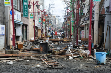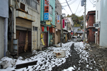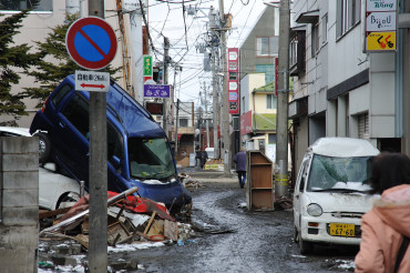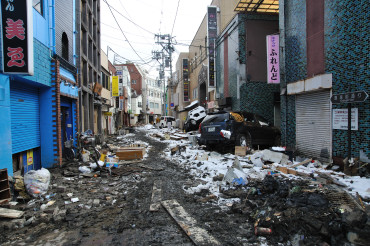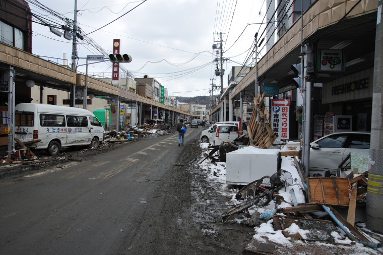 立町商店街 津波で流された車やガレキ。店も1階が浸水しました。アーケードも損壊しました。