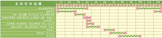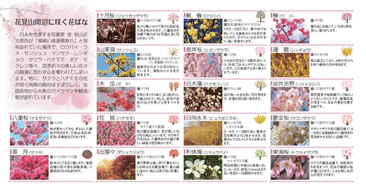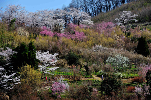 ウメ、ハナモモ、数種類のサクラ、レンギョウ、ボケ、サンシュユ、モクレンなどの花々がいっせいに咲き競う。まさに「桃源郷」の言葉がふさわしいスポットです。 |