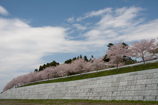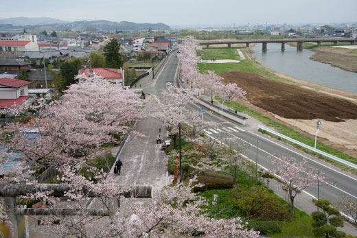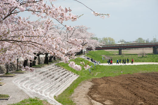 河川沿いに咲く桜並木。天候が良ければ蔵王連峰が見えます。この日は天気は良かったのですが、霞が掛かっていたので見えませんでした。 |